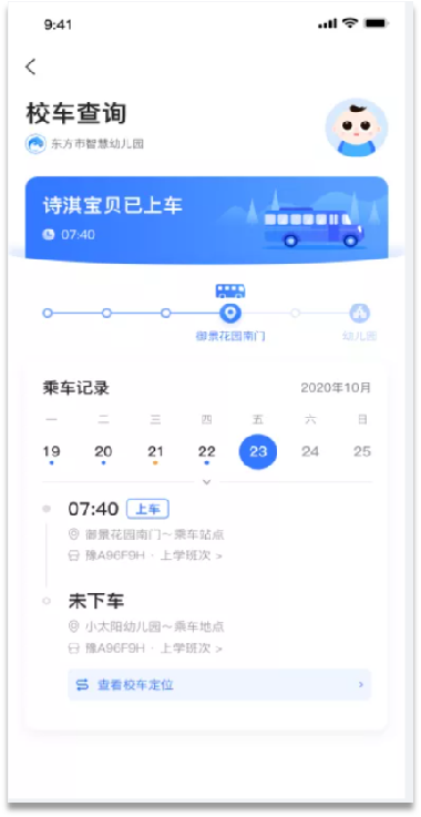 家长可通过手机端实时查询校车的行驶轨迹和到站信息,孩子刷卡/脸上车或到站后,可即时收到孩子的乘车状态通知,便于合理安排时间接送孩子。