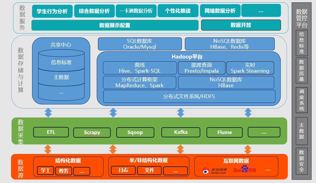 智慧校园数字桌面在校园数据治理数据源的基础上,通过数据指标对人(老师、学生等)、活动(教学、考务、消费、考勤等)、对象(教室、餐厅、体育场馆等)本身进行描述;对三者之间交互关系进行数据描述,以数据指标映射物理校园。项目会采用springcloud微服务、vue前端架构、ELK、Prometheus、Skywalking等软件技术、大数据计算技术、BI可视化技术等计算技术、BP神经网络、人工神经网络等算法技术,实现描述指标数据源指标、数据统计指标、标签应用指标、预警应用指标的落地。项目最终交付数据大屏、消息提醒、软文报告、管理员看板等一系列的产品成果。
