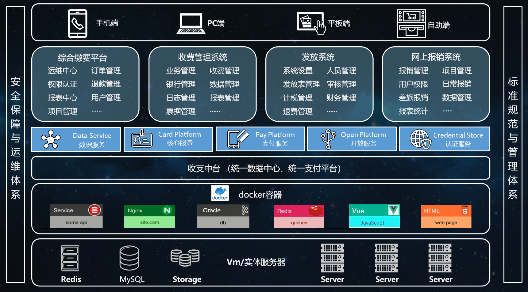 智慧财务平台通过建立校园统一收支平台,融合包括一卡通在内的校园收支业务系统。采用springcloud微服务、vue前端架构、阿里中台架构、Skywalking等软件技术和 docker 容器化部署方式,提供包括数据服务、支付服务、开放服务、认证服务,实现收费管理、缴费、资金发放、退款等财务收支全场景应用,支持一卡通、银行卡、支付宝、微信等所有主流支付方式,支持移动端、PC端、自助端、线下支付等,覆盖了高校管理者、教师、学生、校外人员等的所有收支对象。满足高校资金流转上的所有需求。