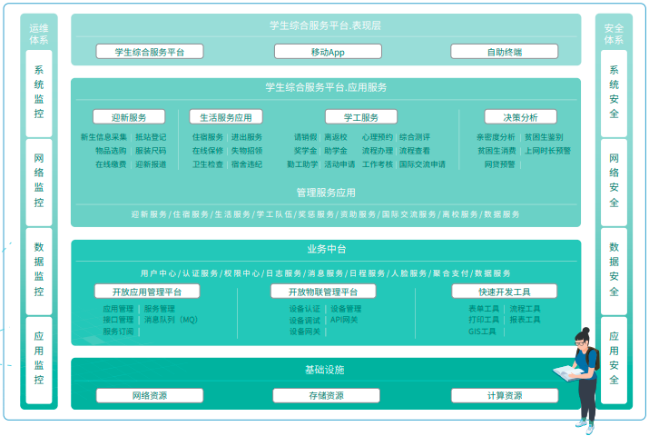 基于微服务架构设计的学生事务一体化服务平台是智慧校园核心业务系统之一,更是高校落实“以学生为本” 的学生工作管理宗旨的重要帮手。以“管理+服务”的设计思想,涵盖招生、迎新、学生工作管理、公寓、离校、就业、校友等服务,涉及学生入学前、入学时、在校期间、毕业以及毕业后的全生命周期管理,从学习、思想、生活等多维度记录学生在校期间的各项信息;同时各子系统业务互相关联,信息互联互通,实现信息数据化、业务流程化、工作系统化等全过程一体化。打破时间、空间的限制,既为学生提供事务即时办理服务;也为高校学生工作管理中心提供更高效、快捷的管理服务。