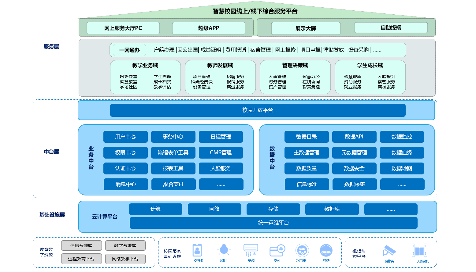 网上服务大厅是智慧校园整体框架中最主要的用户服务窗口,将校内各类资讯、服务、系统入口、消息待办、高频应用等与师生日常科研教学密不可分的信息资源统一聚合,并按照师生身份和功能业务域做合理划分,让师生用户能够以良好的用户体验获得对校内各类信息资源的一站式访问。
