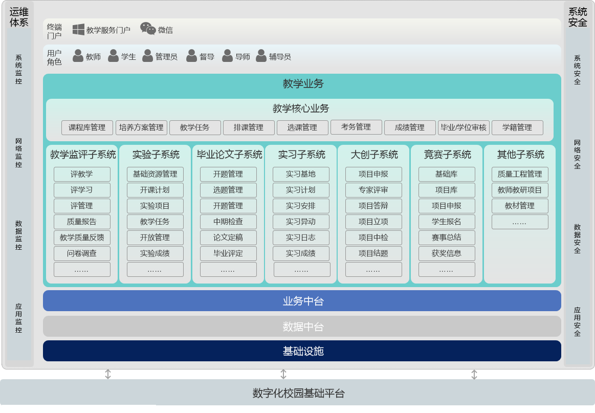 基于微服务架构的教学服务平台,通过将教务核心业务之外的其他教学相关管理业务,包括教学评价、教材管理、实验教学、毕业论文、实习实训、大学生创新创业训练项目、学科竞赛等业务,以微服务方式进行组合,为教学管理提供便捷服务,客户可按需选择。