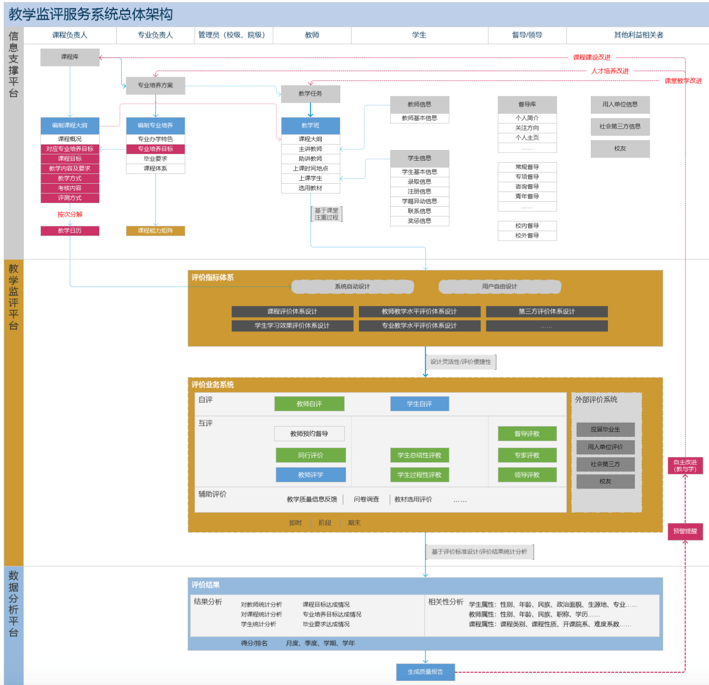 整个评估服务平台提供:评估服务:领导评估、督导评估、教师互评、课程评估、课堂评估、主观评价;评估分析:评估统计、学期小结、主观反馈;多维展示:领导驾驶舱、白皮书。
