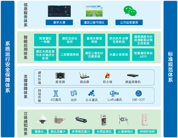依托现代化物联网技术、3S技术、云技术、大数据技术和软件应用技术,建立完善的立体感知体系、支撑保障体系、智能应用体系、信息服务体系,实现灌区的智能化监测预警和自动化控制,提高灌区的现代化管理水平。