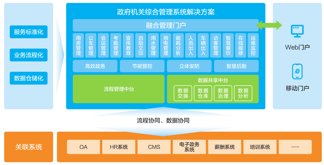 线上门户、移动门户、流程协同,打造一站式的管理服务;集中式共享平台,实现统一的管理和维护