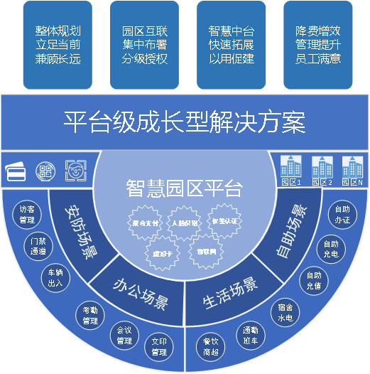 智慧园区一卡通解决方案,基于融合物联网、互联网、云计算、大数据等前沿技术,提供覆盖企业安防、员工生活、后勤服务、办公管理、可视化运营等全场景智能化应用,业务联动,实现企业经营管理的智慧化,员工服务的便利化,建设企业园区生产、生活、管理的美好生态。
