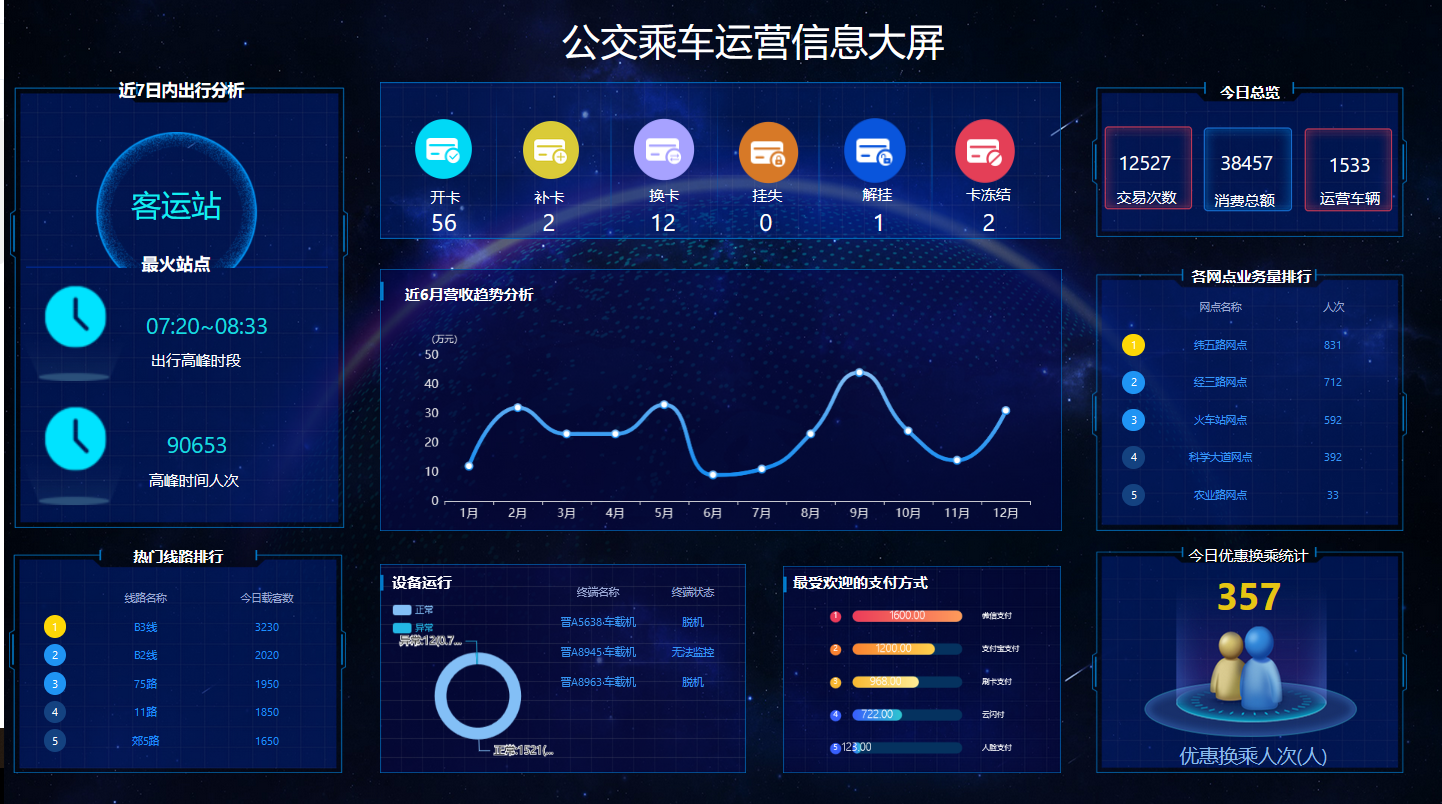 智慧公交数据分析决策平台面向公交指挥中心大屏可视化环境,具备优秀的大数据显示性能及多机协同管理机制,对公交业务数据与交通实时数据进行统一管理,实现城市交通的三位立体可视化智慧管理,提高城市交通运转效率,为城市现代化保驾护航。