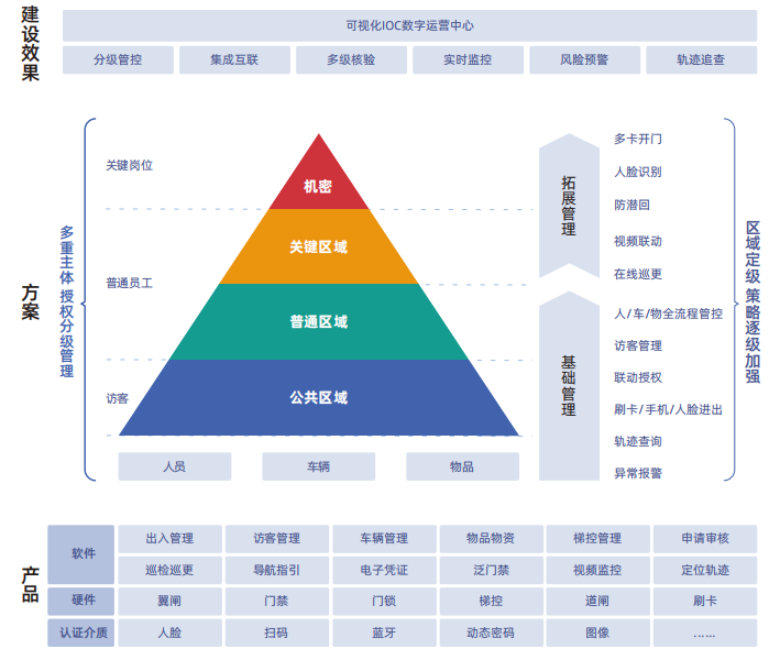 安全,无论在哪个时代对于社会还是企业来说都是赖以生存和发展的基础,传统人工巡逻、固定监控、依靠人防的方式已经无法满足企业需求,在新型智慧园区中,通过建立统一认证平台,定义统一的接入规范,实现门禁、闸机、门锁、访客等各类安防设备的充分集成、联动授权。