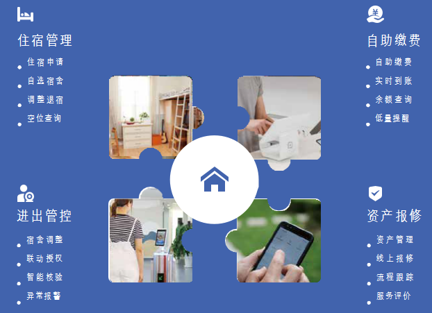 打造一体化管理平台,涵盖住宿管理、自助缴费、进出管控、资产报修在内的10+应用服务,实现无纸化办公、智能决策,提升整体管理效率。