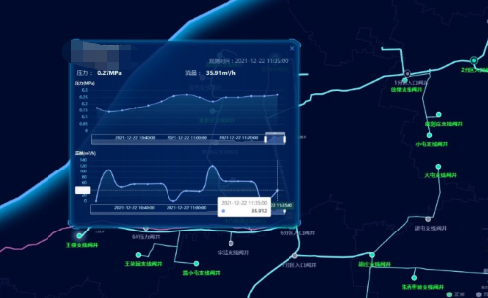 管网监测系统基于管网 GIS和 SCADA监测数据,通过“GIS一张图”实时监测原水、水厂、管网、供水站等主要供水单位的水压、水量、水质状况,并通过一张图实时监测、分级管理,并支持远程实时监测、变化趋势分析,并与水量预测模型、水质预测模型相结合,模拟管网漏损早预警、早处理,降低管网事故风险,提高异常处理效率,保证持续供水,保障供安全。