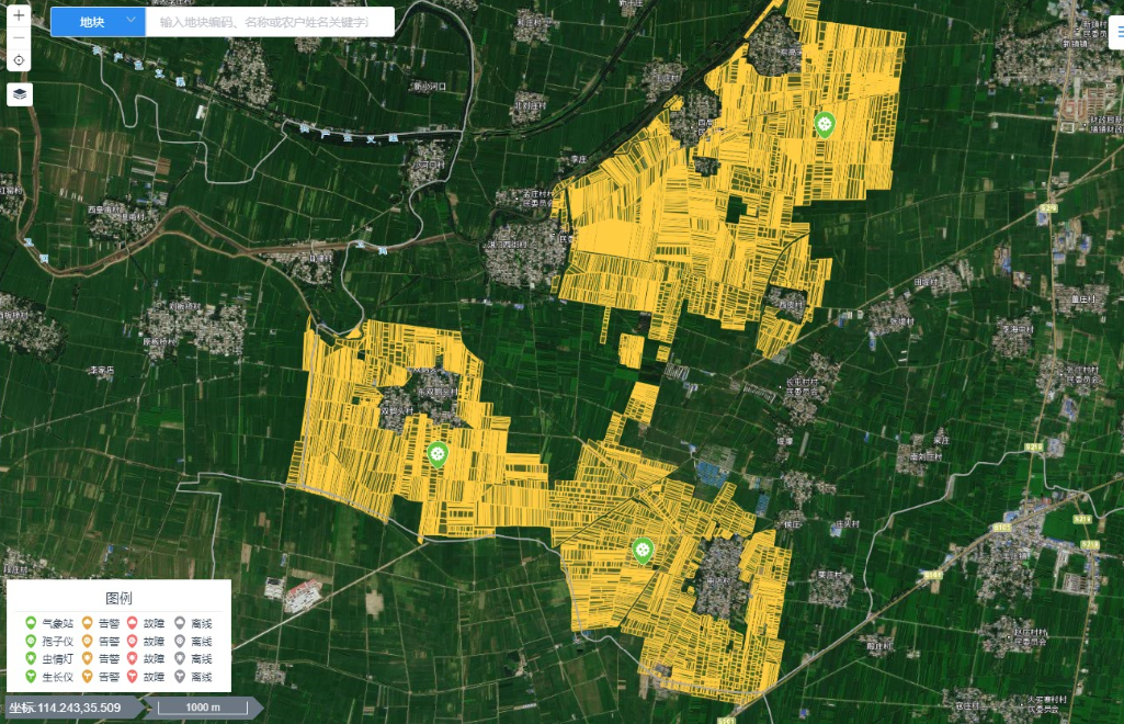 农田地理信息系统采用物联网、卫星定位、GIS、大数据、视频等技术,通过对土壤墒情、病虫害、苗情、气象环境、空间地理等数据的实时采集、分析以及制定农田的种植计划,可方便、直观的展示农田的空间分布、基础信息、种植结构以及设备的空间分布、实时监测数据等,从而实现对农田的智能感知和智能预警,为管理者决策提供助力。