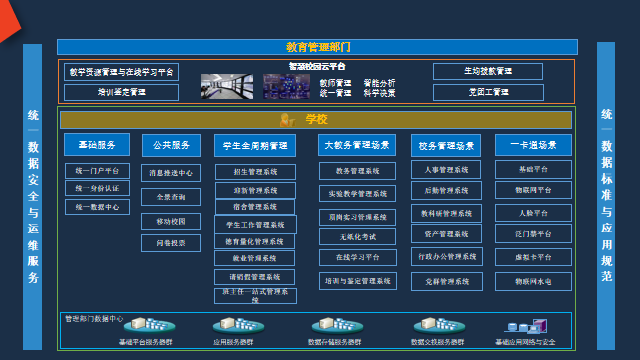 智慧校园云平台为区域内中等职业学校提供统一入口,要实现各学校业务数据逻辑上完全独立,消除现有信息化形成的信息孤岛,减少重复投资,实现统一建设、统一维护、共享使用,又能够通过对各学校的业务数据进行数据挖掘汇总,为上级管理部门提供决策支持,达到一个平台四个实现的目标;可以实现管理部门对下属学校的全视图监管,实现师生群体身份数据的动态精准验证,实现学校自身应用及管理的全场景支持,实现政府管理部门对中等职业教育体系的资金安全管理与精准划拨。本平台建设立足教育业务应用,实现教育云资源集约化管理与资源均衡分配,满足教育信息化快速发展提出的更高需求,一个平台服务N个学校,真正实现智慧化管理。
